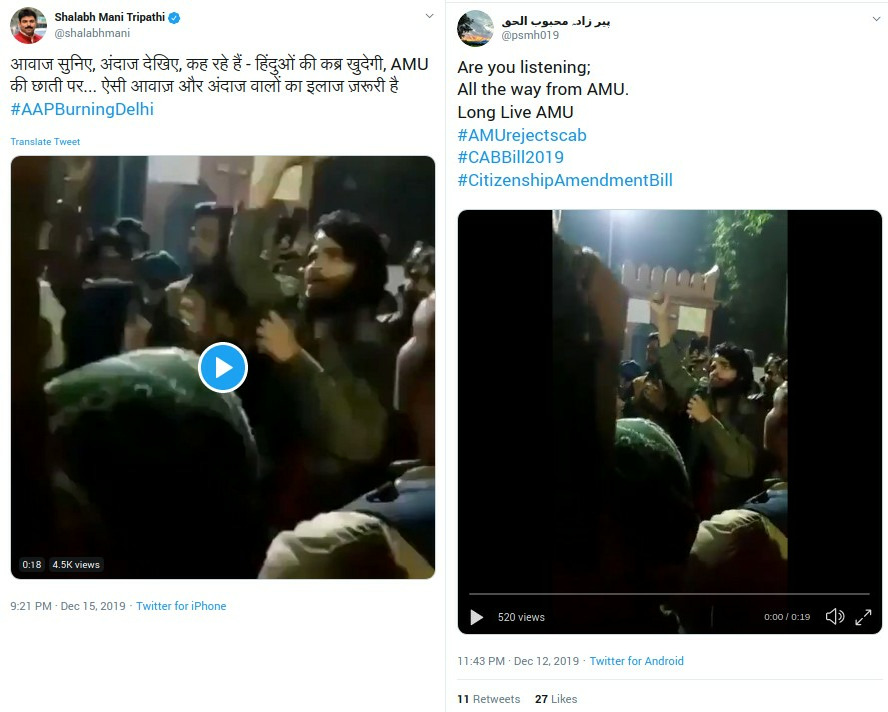 BJP social media head Amit Malviya tweeted the same clip (left) as Bagga’s with the message, “AMU students are chanting ‘हिंदुओ की कब्र खुदेगी, AMU की धरती पर”.
