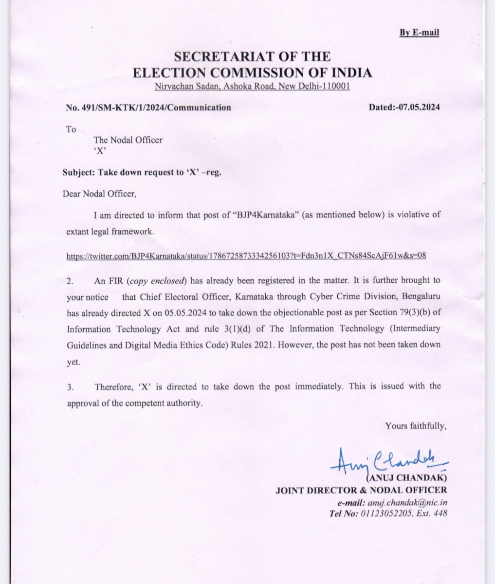 The Election Commission then issued a statement on the day of polling in Karnataka asking X (formerly Twitter) to remove the video posted by the BJP’s Karnataka unit, citing violations of the existing legal framework.