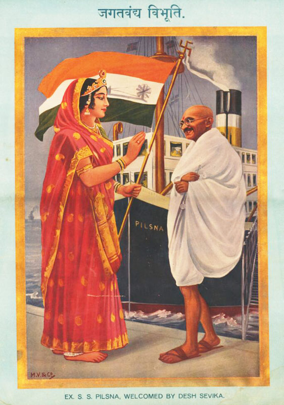 Poster of Mother India transferring her nation-care duties to Gandhi from the Priya Paul Collection.