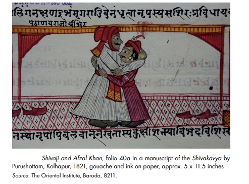 3a Shivaji and Afzal Khan, folio 40a in a manuscript of the Shivakavya by Purushottam, Kolhapur, 1821, gouache and ink on paper, approx. 5 x 11.5 inches Source: The Oriental Institute, Baroda, 8211, from the Holly Schaffer essay.