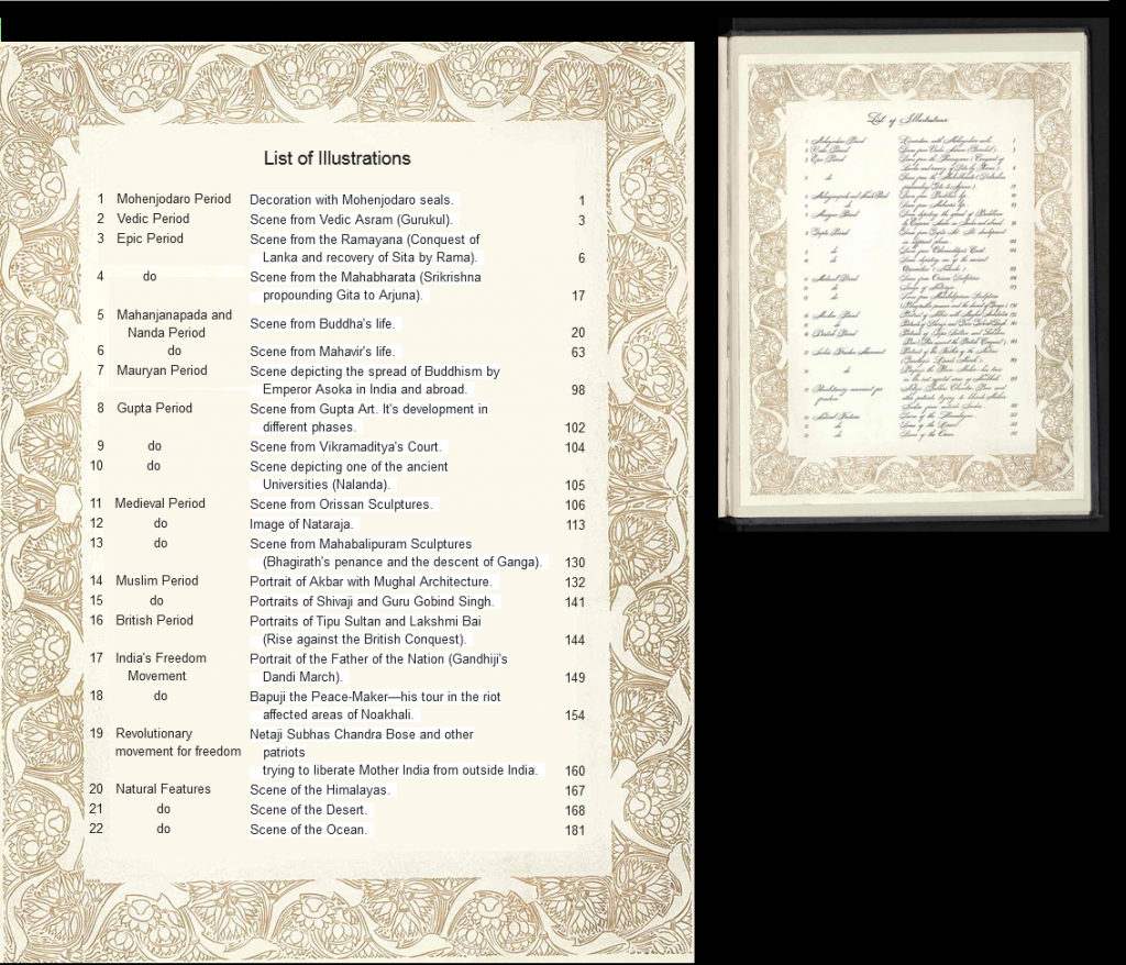The 22 illustrations (click to see all illustrations and see index of illustrations below) in the same constitution have the 'spiritual' presence of Hindu Deities, Buddha and Mahavir, one Muslim ruler (Akbar), 'nationalist' Hindu rulers, Gandhiji (twice) and Netaji Subhash Chandra Bose among others. It comes across as a secular-modern Islamicate illuminated manuscript, but has an iconographical programme not much unlike the secular-modern Hindu temple-museums mentioned above.