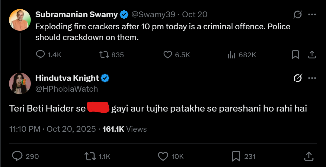 Perhaps the vilest attack was faced by senior BJP leader Subramaniam Swamy who wrote on X, “Exploding fire crackers after 10 pm today is a criminal offence. Police should crackdown on them”. Right-wing influencer Chandan Sharma (Hindutva Knight/@HPhobiaWatch) commented to this targeting Swamy’s daughter, journalist Suhasini Haidar, using obscene language for being married to a Muslim man.