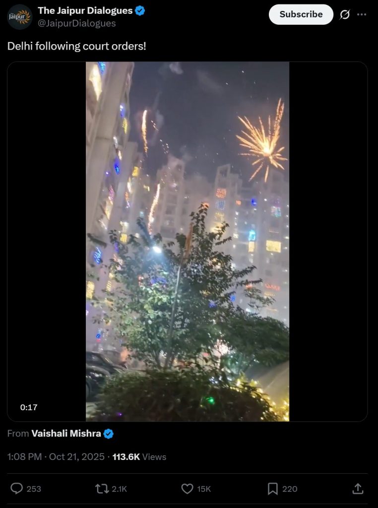 It should be noted that this year, the Supreme Court removed the blanket ban on the sale of firecrackers in Delhi and the National Capital Region (NCR) and allowed the sale of ‘green crackers’ ahead of Diwali. It also fixed a two-hour time period (8pm to 10pm) for bursting crackers. The order, passed by Chief Justice B.R. Gavai and Justice K. Vinod Chandran, was described by the Bench as a “test case” to check if a regulated framework could align with pollution control efforts.