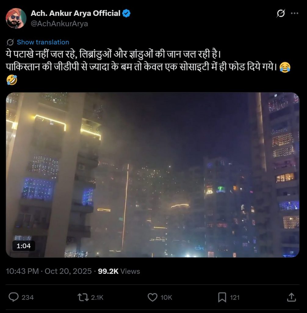 X user Vaishali Mishra (@1VaishaliMishra), who describes herself as an advocate in her bio, posted a video of crackers being burst and wrote a caption in Hindi that can only be described as perverse. It said, “The society folks have been smoked out 😊 Tonight, the dogs won’t get any sleep”. (Archive)