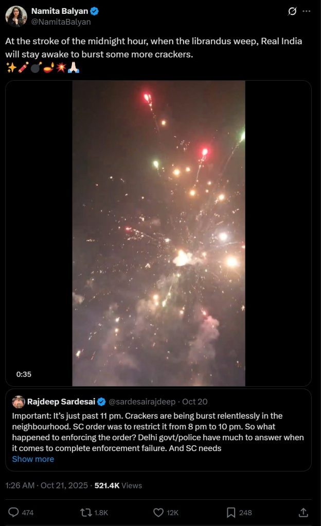 News18 journalist and anchor Rubika Liyaquat shared an X post on October 20, where she prided herself on the fact that bursting of firecrackers will cause trouble to fellow citizens.