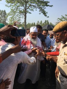 Maulana Badruddin Ajmal arrives at one of his last rallies for the elections in Assam at Kolakapani char, Dhubri. Credit: Makepeace Sitlhou