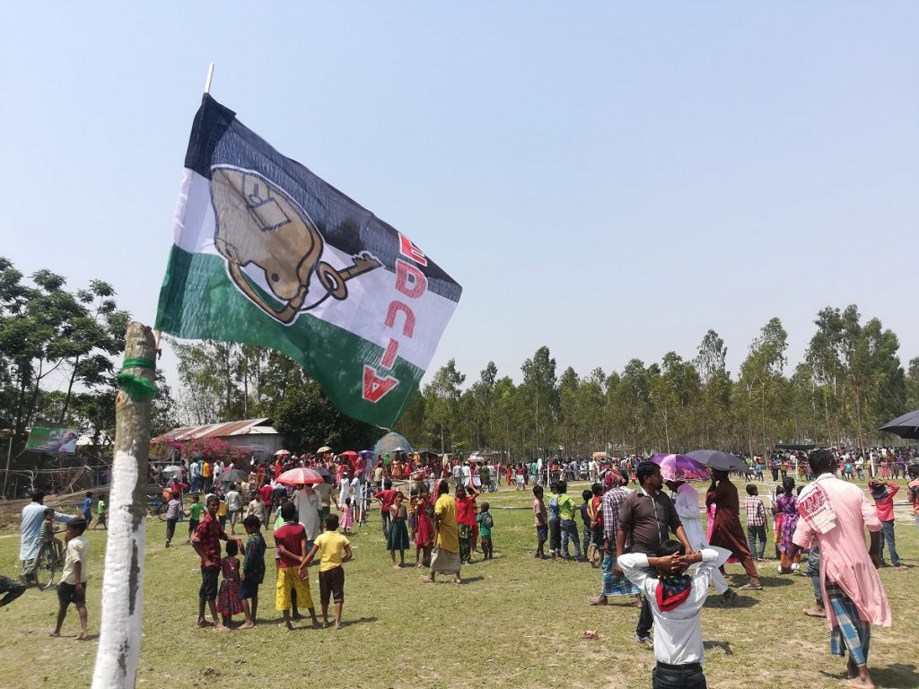 Residents from different chars gather at Kolapakani char in Dhubri for an AIUDF rally on April 20, 2019. Credit: Makepeace Sitlhou