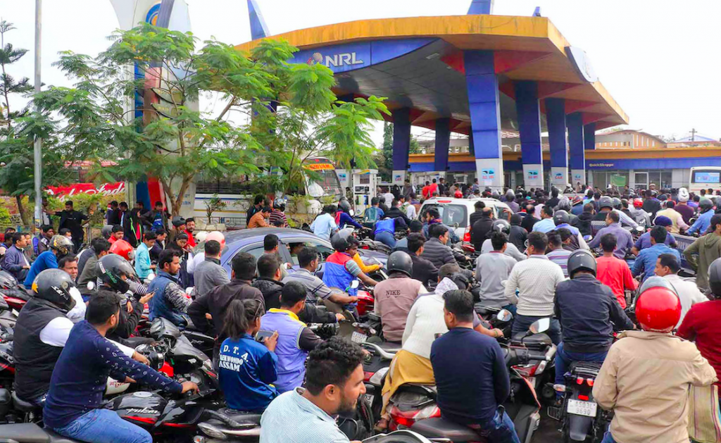 People wait in queues outside a petrol pump during relaxed hours of curfew, which was imposed in vew of various protests against the Citizenship Amendment Bill, 2019, in Jorhat, Assam, Friday, December 13, 2019. Photo: PTI