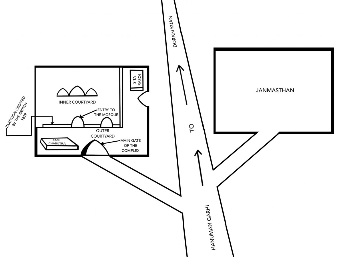 Rough map showing the location of the Babri Masjid, Ram Chabutra, Sita Rasoi and the Janmasthan in the Kot Ramachandra area.