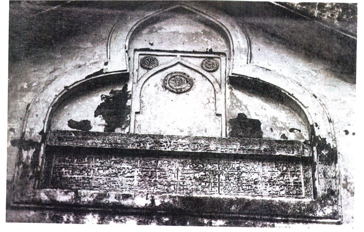 Inscription located outside the Babri Masjid, above its main entrance door. The inscription contains 8 couplets of Persian verse.