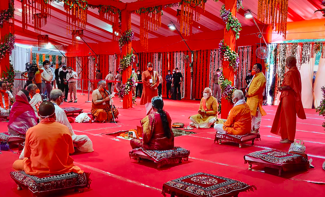 Prime Minister Narendra Modi along with UP governor Anandiben Patel, chief minister Yogi Adityanath, RSS chief Mohan Bhagwat and others perform Bhoomi Pujan rituals for the construction of the Ram Mandir, at Ayodhya on August 5. Photo: PTI/File