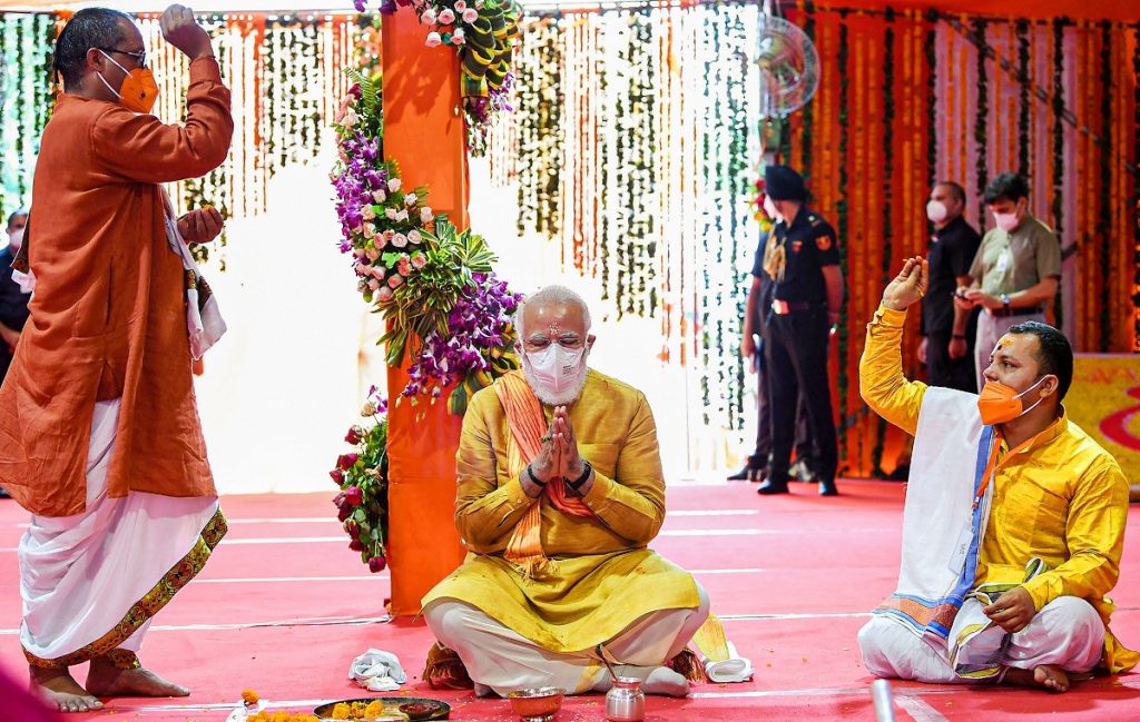 PM Narendra Modi takes part in the bhoomi pujan for the construction of a Ram temple in Ayodhya, August 5, 2020. Photo: PIB