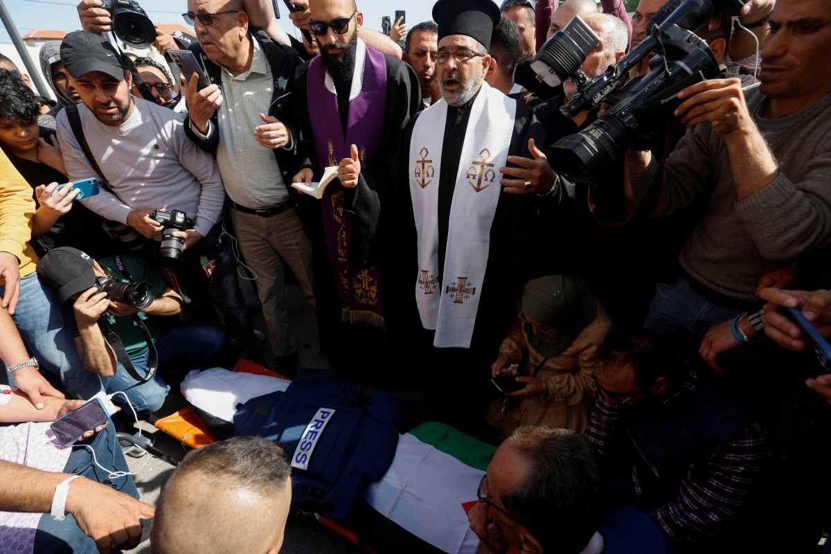 Mourners gather near the body of Al Jazeera reporter Shireen Abu Akleh, who was killed by Israeli army gunfire during an Israeli raid, according to the Qatar-based news channel, in Jenin in the Israeli-occupied West Bank May 11, 2022. Israeli military said Abu Akleh may have been shot by Palestinians as they clashed with its troops. Photo: Reuters/Mohamad Torokman