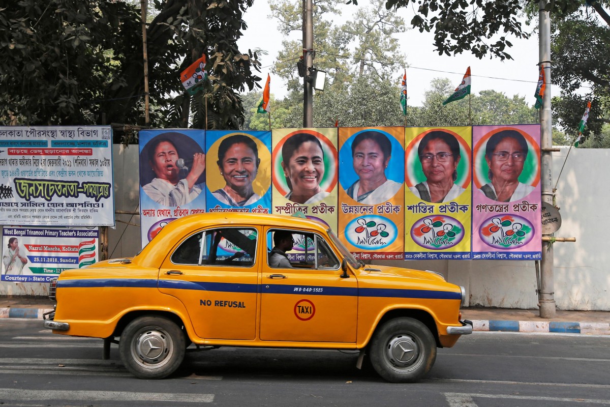 A taxi drives past a poster of West Bengal chief minister Mamata Banerjee in Kolkata, February 9, 2019. Photo: Reuters/Rupak De Chowdhuri