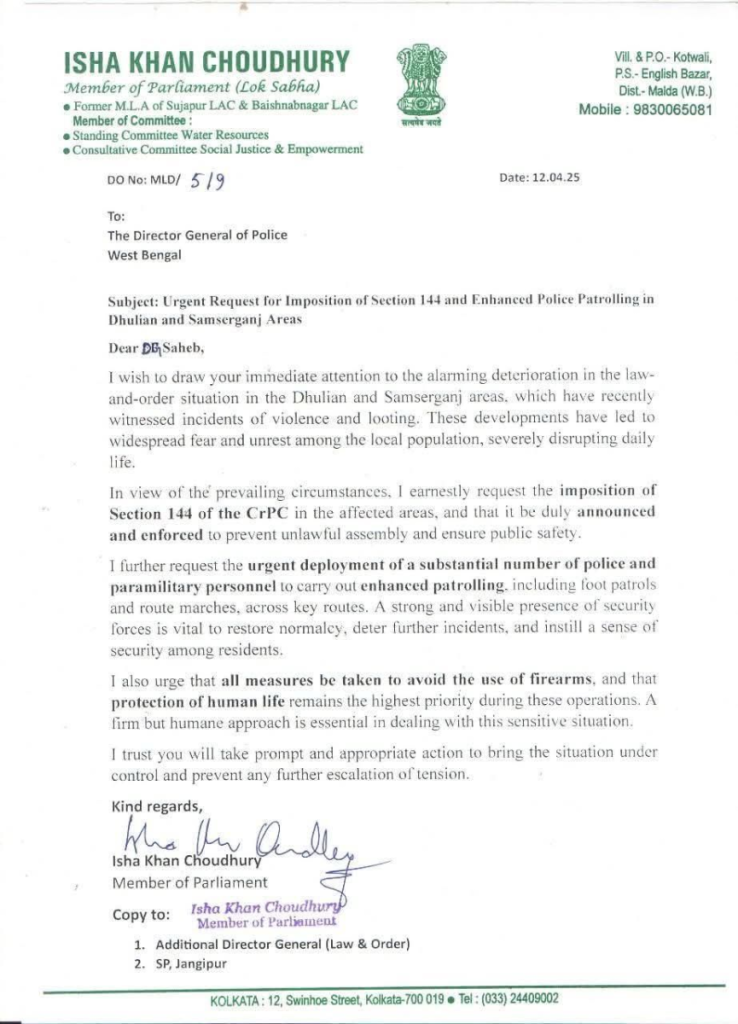 On Saturday, Congress MP from Malda Dakshin, Isha Khan Choudhury wrote to the state police DGP requesting army deployment to control the situation.