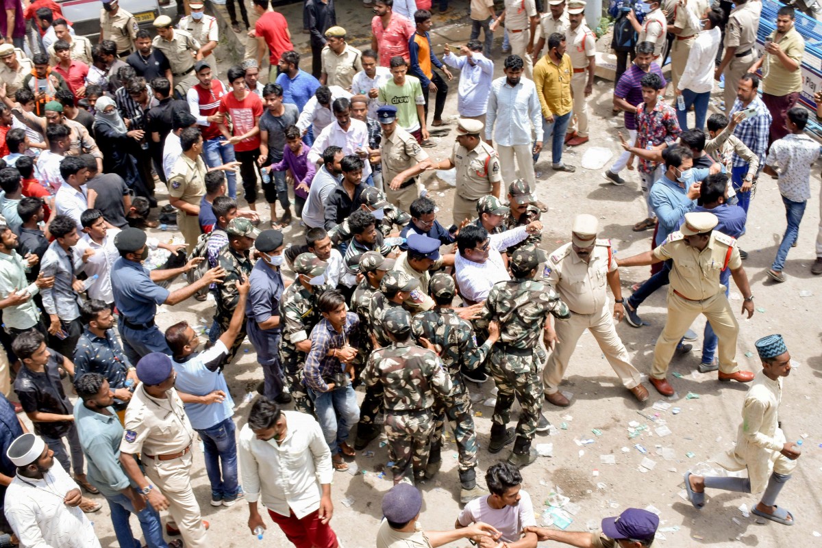 Police in Hyderabad's Shalibanda trying to wrangle crowds protesting against Singh's remarks on Wednesday, August 24. Photo: PTI.