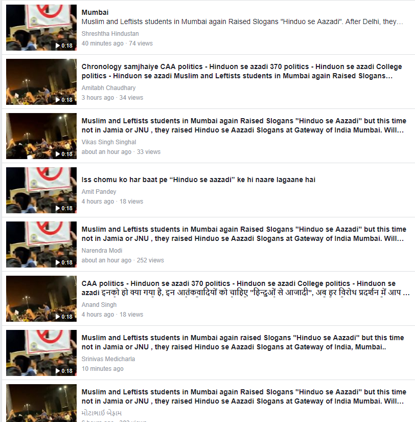 BJP Delhi spokesperson Tajinder Bagga tweeted an 18-second clip of a protest at the Gateway of India, Mumbai on the intervening night of January 5-6. The protest was against the violence at JNU Delhi, where masked goons entered the campus with weapons and thrashed several students. The sloganeering at the Mumbai protest was led by former JNU student Umar Khalid. “Muslim and Leftists students in Mumbai again Raised Slogans “Hinduo se Aazadi” but this time not in Jamia or JNU , they raised Hinduo se Aazadi Slogans at Gateway of India Mumbai, (sic)” claimed Bagga. His tweet has garnered close to 9,000 retweets.