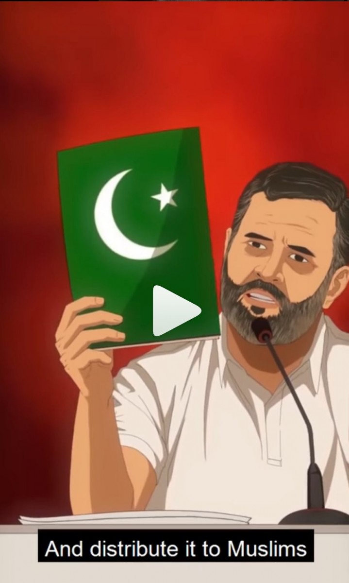 On April 30, the BJP released an animated campaign video on its verified Instagram handle (bjp4india) which is solely about the villainization of Muslims. In it, Rahul Gandhi is portrayed as holding the party’s manifesto, which then turns into the Pakistan flag (Photo below, this is used as the thumbnail of the video as well). The voice-over says, “If Congress comes to power, it will snatch all the money and wealth from non-Muslims and distribute them among Muslims, their favourite community.”