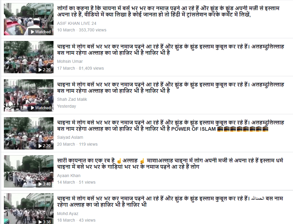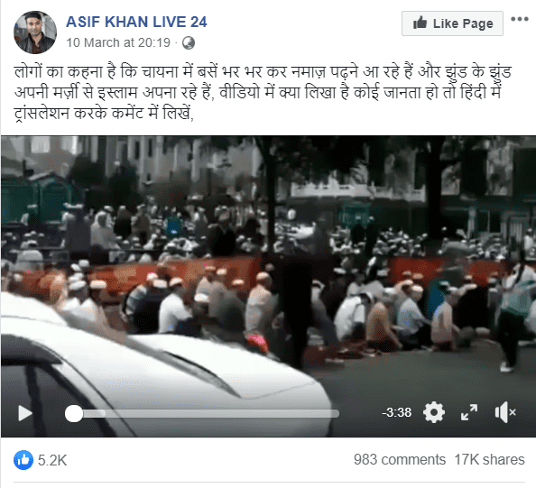 The video description reads, “It is being claimed that people are coming loaded in buses in China to read namaz and willingly embracing Islam. If anyone knows what is written on the buses comment in Hindi and try to tell where the video is from. [Translated from लोगों का कहना है कि चायना में बसें भर भर कर नमाज़ पढ़ने आ रहे हैं और झुंड के झुंड अपनी मर्ज़ी से इस्लाम अपना रहे हैं, वीडियो में दिख रही बसों पर क्या लिखा है कोई जानता हो तो हिंदी में ट्रांसलेशन करके कमेंट में लिखें,साथ ही वीडियो कहाँ का है बताने की कोशिश करें].”