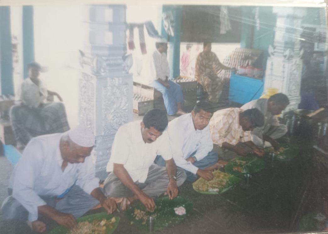 A photograph, said to be 35 years old, of Muslim devotees eating meat cooked at the dargah. Photo courtesy: Althaf, Sikandar Auliya dargah, Madurai.