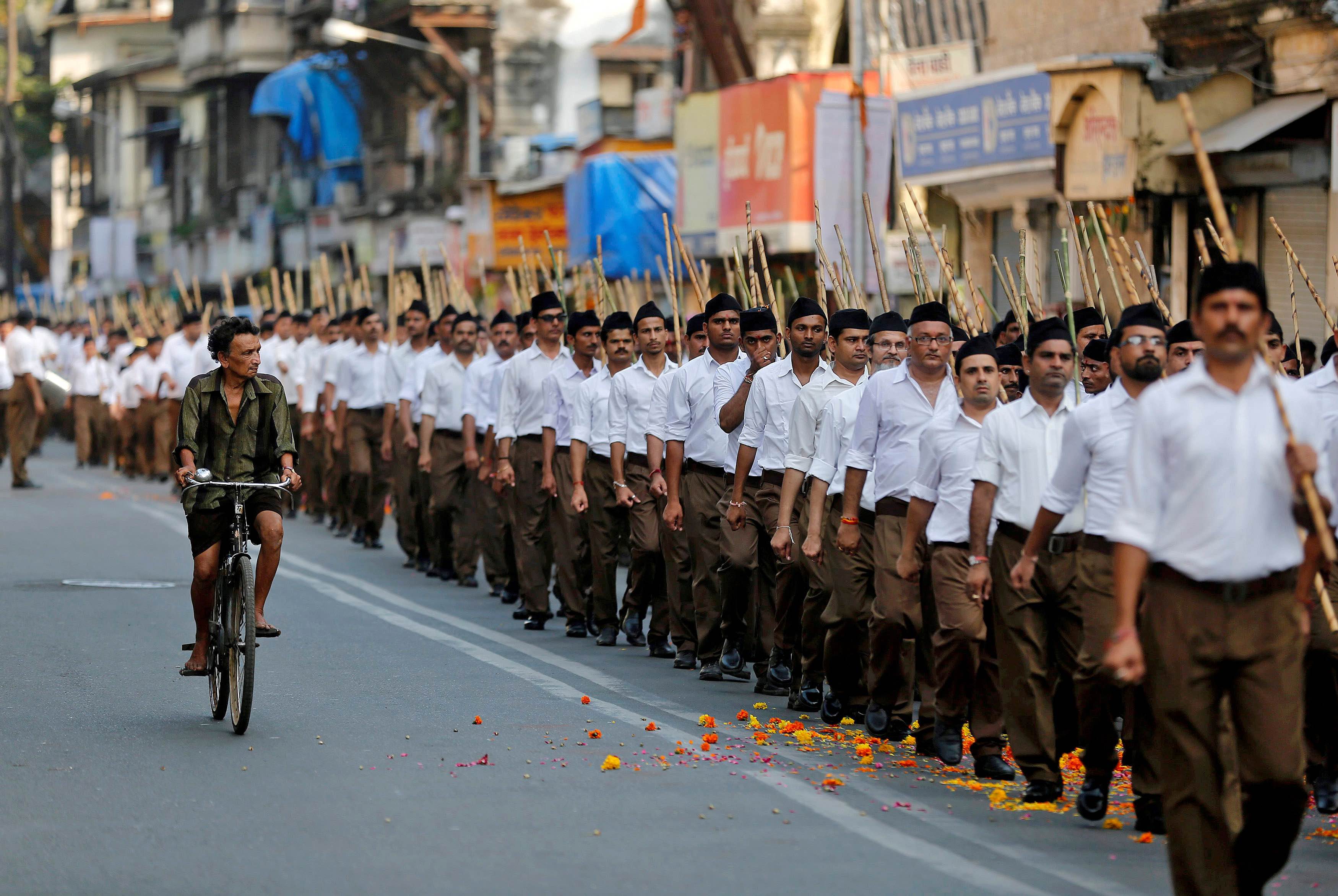 A man rides his bicycle past volunteers of the Hindu nationalist organisation Rashtriya Swayamsevak Sangh taking part in the "Path-Sanchalan", or Route March during celebrations to mark the Vijaya Dashmi or Dussehra in Mumbai, India October 11, 2016. Photo: Reuters/Shailesh Andrade/File Photo
