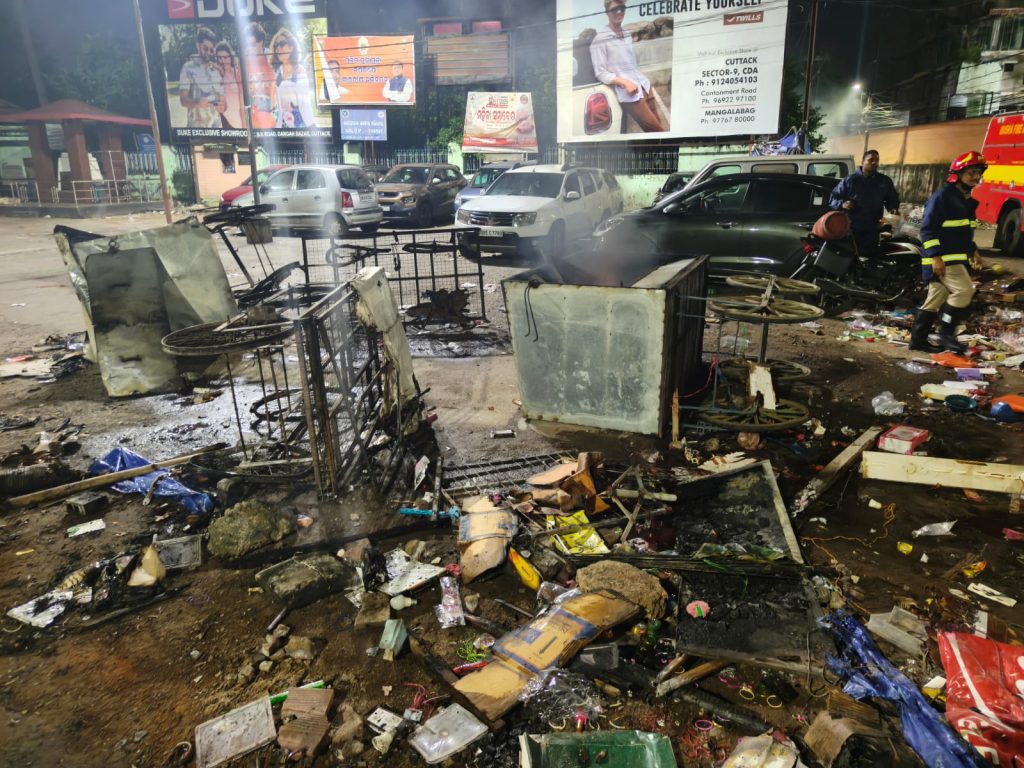 Cuttack: Firemen stand near charred remains of carts and other things after fresh incidents of violence linked to a group clash two days ago during a Durga idol immersion procession, in Cuttack, Odisha, Sunday, Oct. 5, 2025. Photo: PTI.