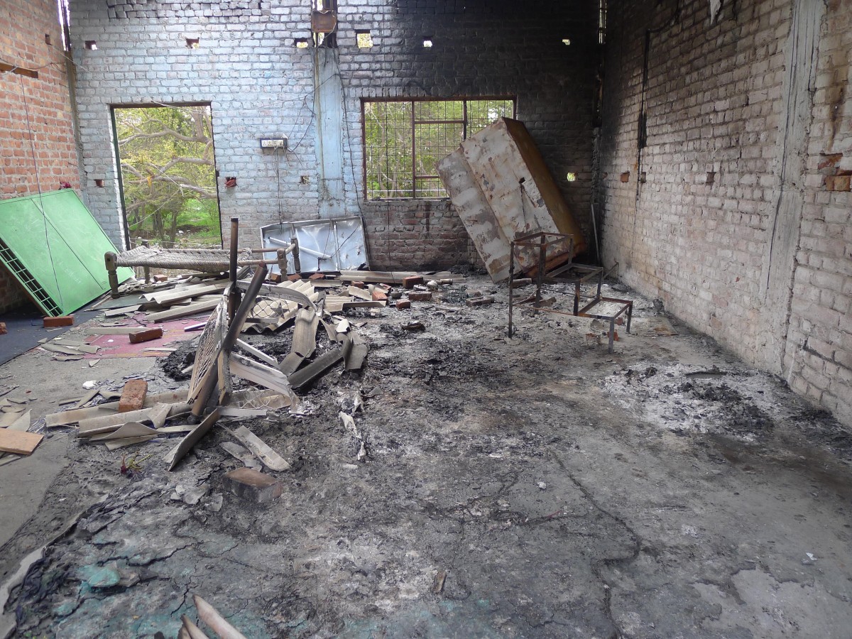 You can hear birdsong and smell fresh dung as Hasan and his sons accompany us to the mosque where it all began. Clearly subject to more than one attack, and burnt, it looks derelict and abandoned. Hasan identifies a mangled mess of metal as the metal stretcher that was used to take the dead for burial. In a ghastly twist to our little expedition, the children, trying to be helpful, rummage among the cinders and fish out charred remains of the Quran and the books that were used to teach Urdu.