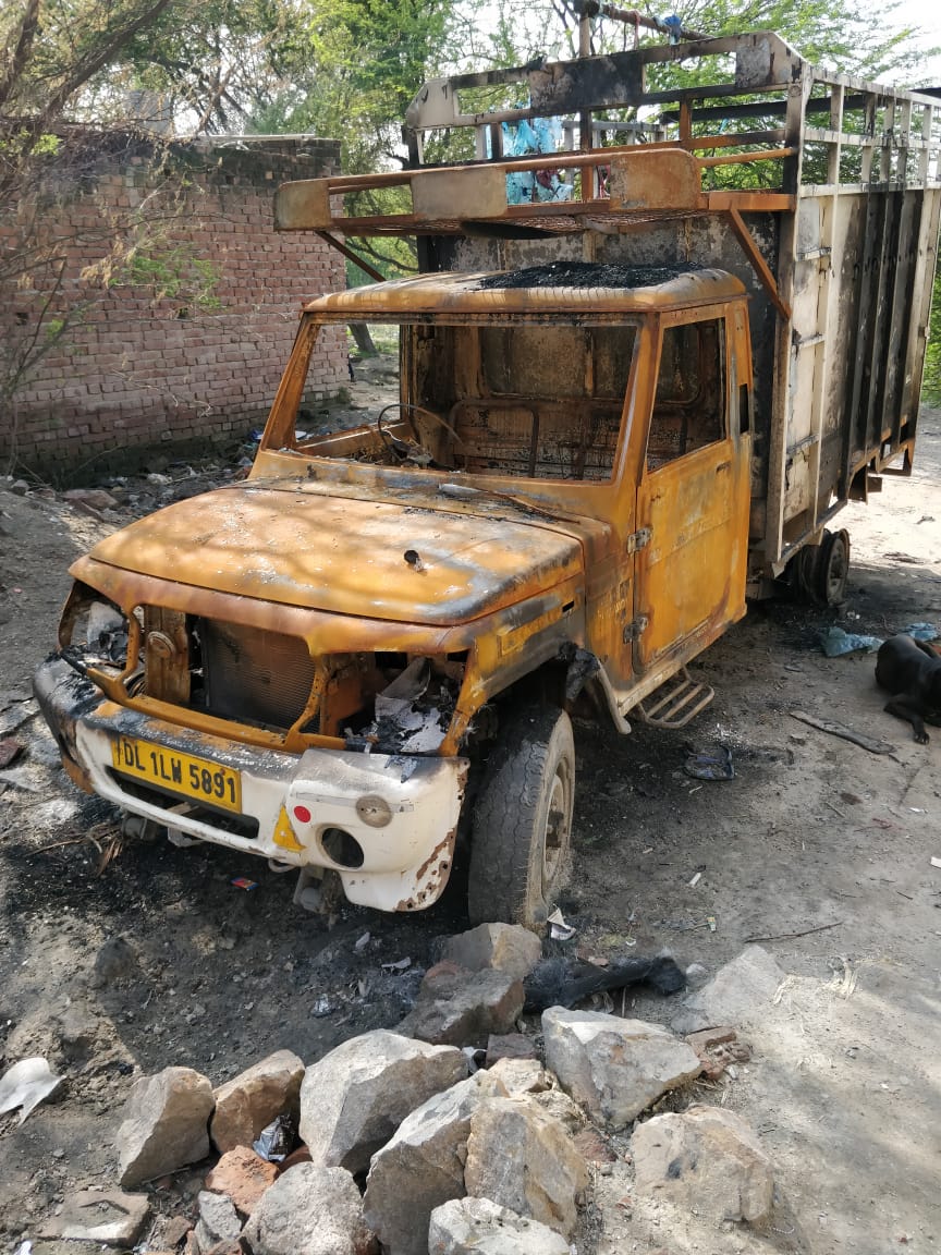 The family’s egg business has been derailed, with trays full of rotting eggs in their front room. We almost fail to notice, until soft-spoken Rizwana points it out, the charred yellow Mahindra Bolero maxi-truck that grew their business. Hasan drove it to Punjab to bring back large stocks of eggs and to transport them for sale in Delhi. The couple, who had recently paid off a loan on the truck, installed CCTV cameras to protect it at night. Efficient mobs destroyed the cameras when they attacked.
