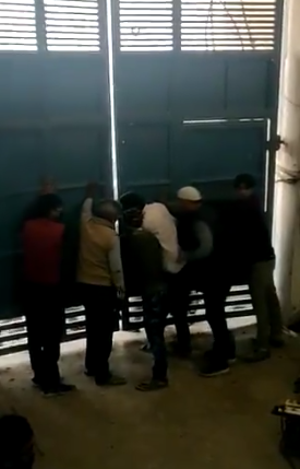 Screengrab from a video shared by Tahir Hussain with journalist Rajdeep Sardesai, purportedly showing men protecting his doorway from being broken into.