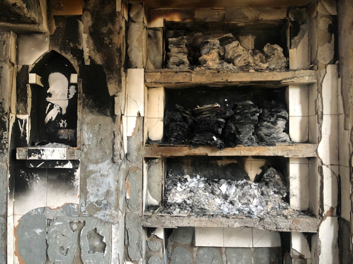 Shelf with burnt copies of the Quran inside Farooqia Masjid. Photo: Seemi Pasha