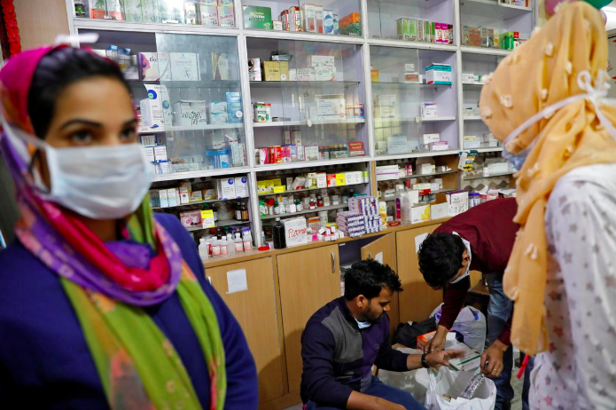 A February 27 photo of staff members speaking in the lobby of the Al-Hind Hospital. Photo: Reuters/Anushree Fadnavis.