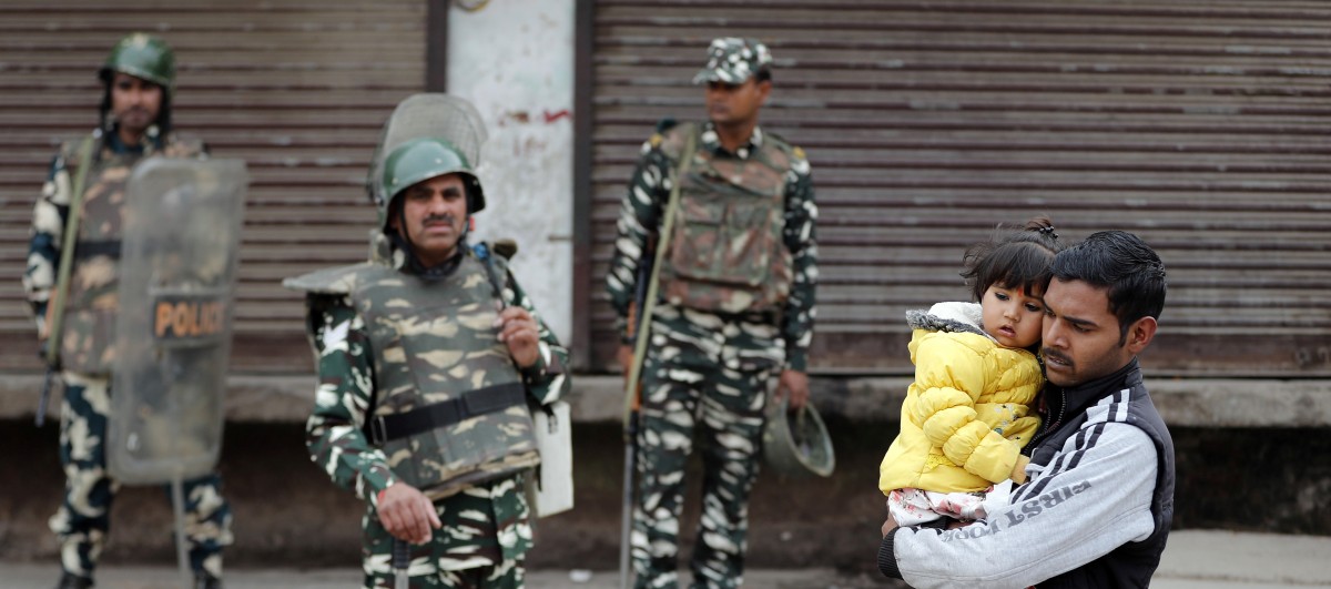A man carrying a child walks past security forces in a riot-affected area in New Delhi, February 27, 2020. Photo: Reuters/Adnan Abidi