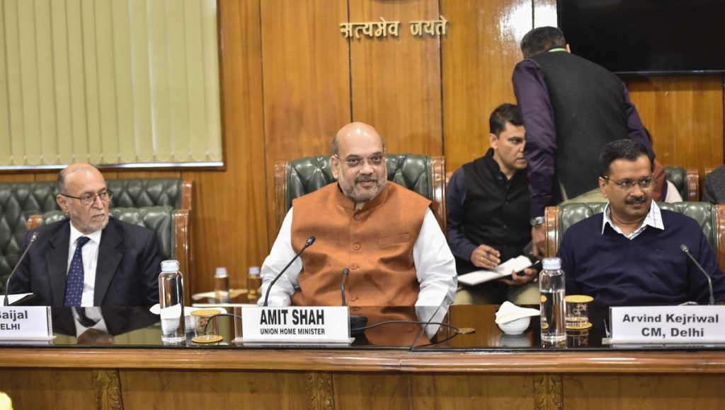 (L-R) Delhi LG Anil Baijal, home minister Amit Shah and Delhi CM Arvind Kejriwal at a meeting on Tuesday. Photo: PTI
