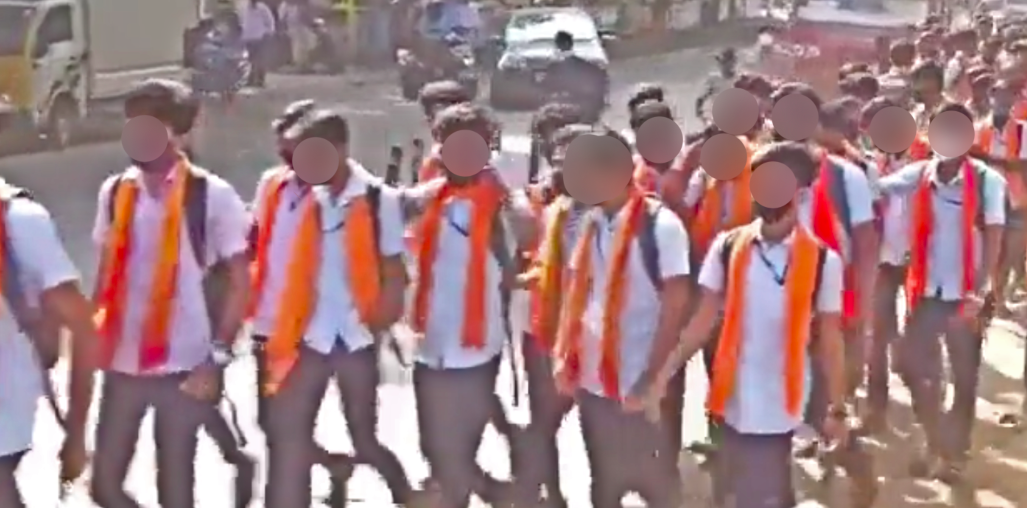 Screengrab of a video showing students in saffron scarves. Their faces have been blurred because some may be minors.
