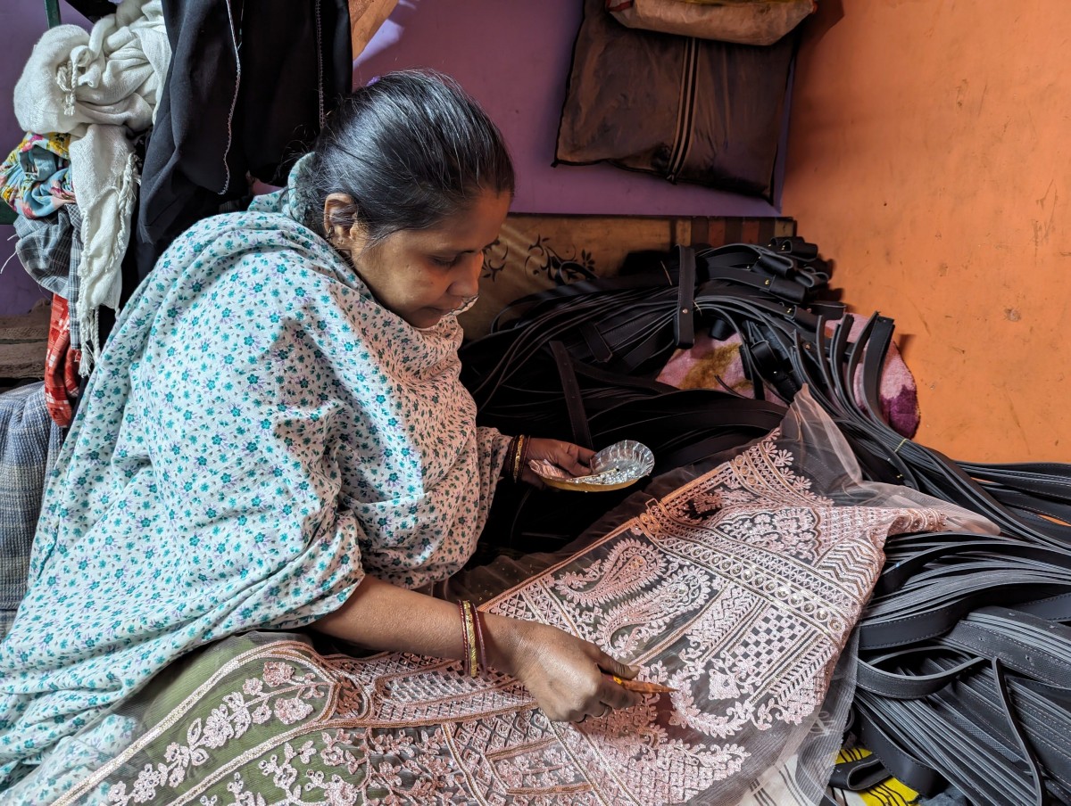 Ruksar makes around Rs 9,000 a month a day for odd jobs like sticking sequins on fabrics and punching holes in faux leather belts, from her home. In February 2020, the goods she was working on were destroyed during the riots, she says, costing her thousands of rupees. She hasn’t been compensated.