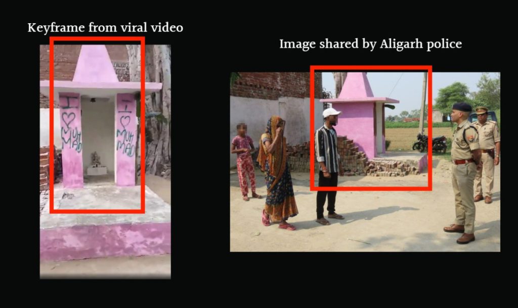 One of the images shared by the Aligarh police shows a police officer interacting with two individuals in front of a pink temple. According to a Dainik Bhaskar report, slightly different graffiti was also sprayed on a white temple.