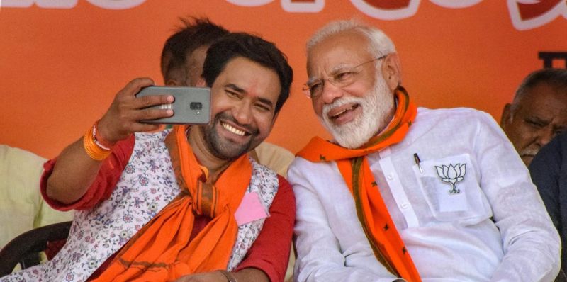 UP chief minister Yogi Adityanath addresses and election rally in the presence of actor Dinesh Lal Yadav and BJP candidate from Lalganj Neelam Sonkar in Azamgarh district on May 9, 2019. Credit: PTI