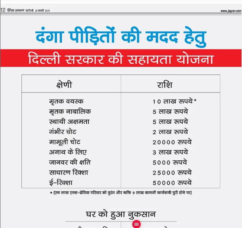 दंगा पीड़ितों के लिए दिल्ली सरकार द्वारा दिये जाने वाले मुआवज़े का विवरण। यदि आप किसी दंगा पीड़ित को जानते हैं तो उससे साझा करें। और हर संभव मदद करें।