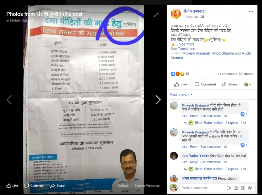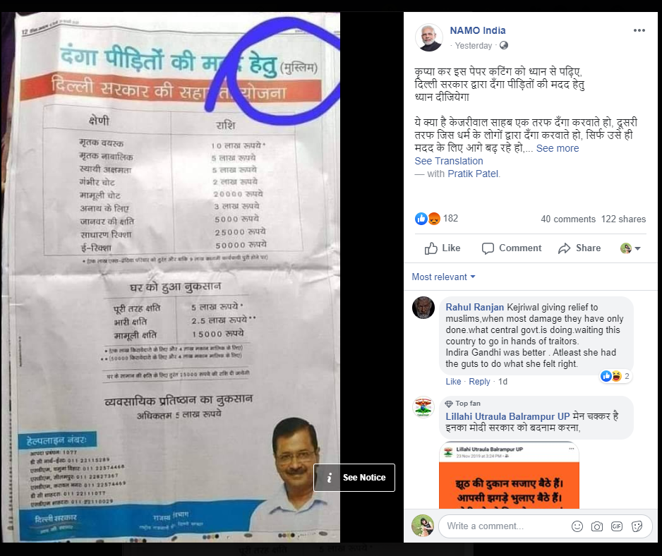 New Delhi: An alleged newspaper clipping has been shared on social media. It claims that the Aam Aadmi Party (AAP) is providing relief assistance to only Muslim victims of the Delhi riots. Below is a screenshot of the post from the Facebook page NAMO India. The advert reads, “दँगा पीड़ितों की मदद हेतु (मुस्लिम)” which translated to – “For the help of riot victims (Muslims).”