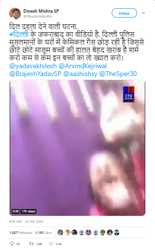 On February 25, Twitter user Dinesh Mishra tweeted the 39-second clip and claimed, “Heartbreaking incident. Video from Delhi’s Jafrabad. Delhi police are pumping chemical gas inside Muslim homes. This has left the [health] condition of little children in a bad state. Have some shame and at least think about these kids.”. The tweet has amassed close to 1,000 retweets so far. It has now been taken down.