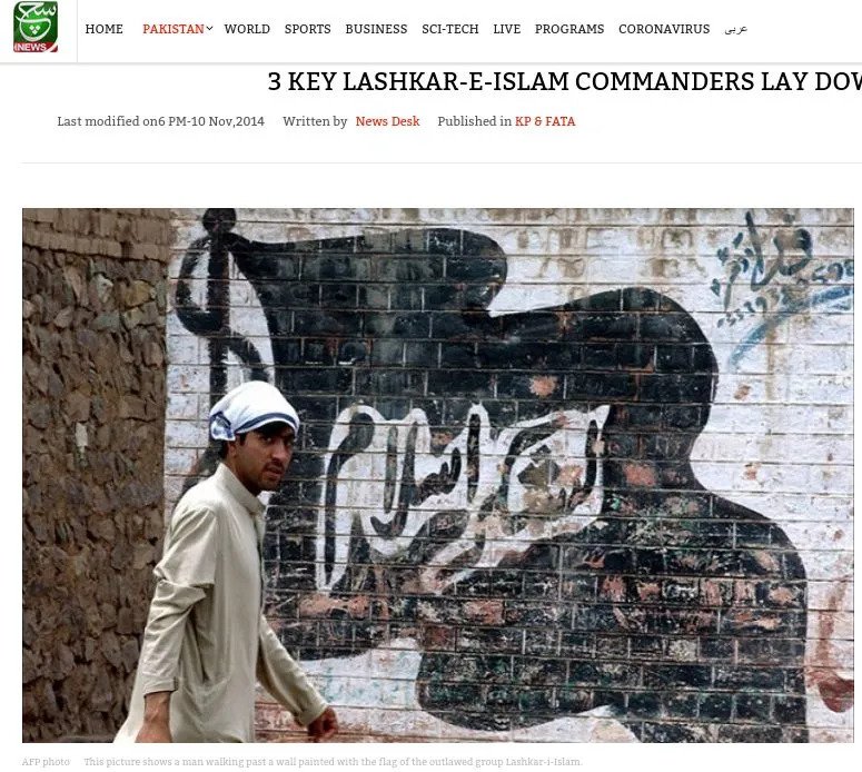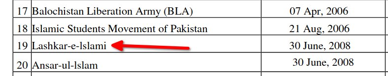 It is noteworthy that the outfit’s name transliterated in English is also written as “Lashkar-e-Islami”. This is the spelling given in the document below prepared by the National Counter Terrorism Authority (NACTA) of Pakistan. However, both 'Islam' and 'Islami' are used even on Pakistani government websites. This is not the case with “Lashker”. Readers are requested to check for themselves by searching “lashker” site:gov.pk on Google.