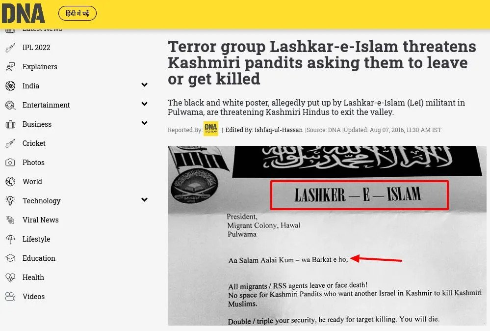 लश्कर-ए-इस्लाम ने कश्मीरी पंडितों को दी धमकी, कहा- "कश्मीर छोड़ें या धर्म बदलें"#AarPaar #Hindu #Secularism #SecularPolitics @AMISHDEVGAN pic.twitter.com/vNJCw8Ga8t— News18 India (@News18India) April 13, 2022
