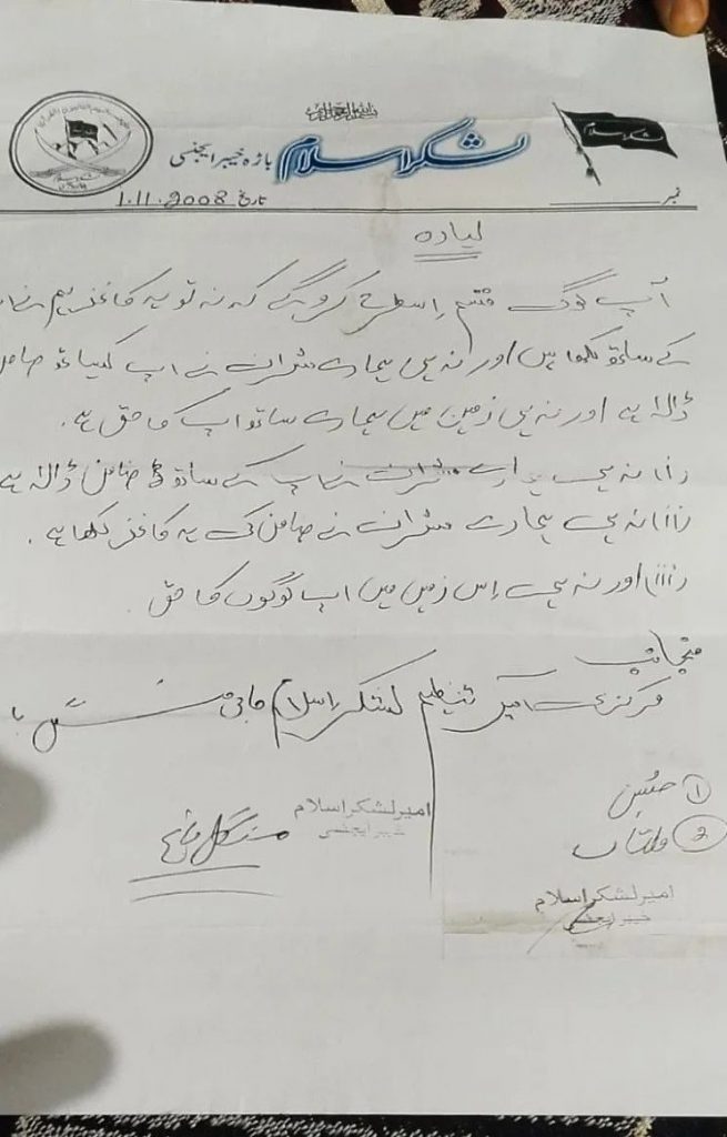 The letter merely says “commander” at the end, without the name and signature of Lashkar-e-Islam’s commander.