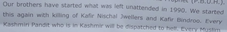There is a portion in the letter that says, “We have started what was left unattended in 1990. We started this again with the killing of Kafir Nischal Jewellers and Kafir Bindaroo.”
