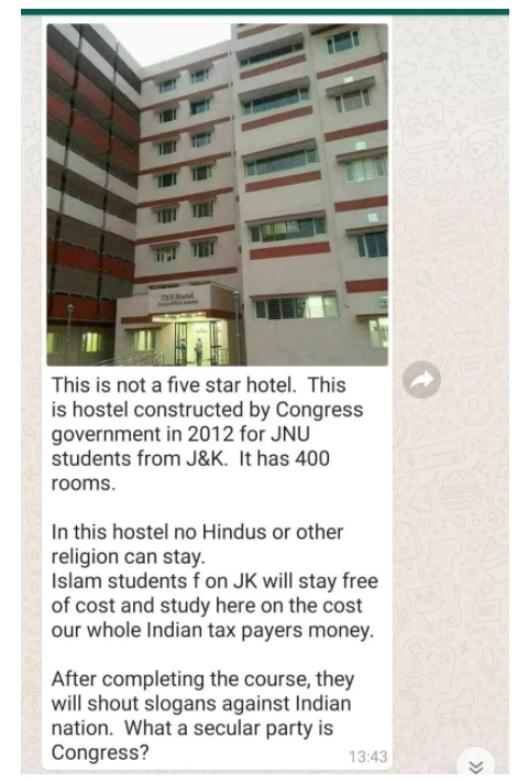 A widespread WhatsApp forward carries a picture of a hostel building claiming that the Congress government had constructed a 400-room hostel for Jammu and Kashmir students at Jawaharlal Nehru University (JNU) in 2012. “In this hostel, no Hindus or other religions can stay.” The message claimed that Muslim students from J&K are accommodated in the college hostel for “free”.
