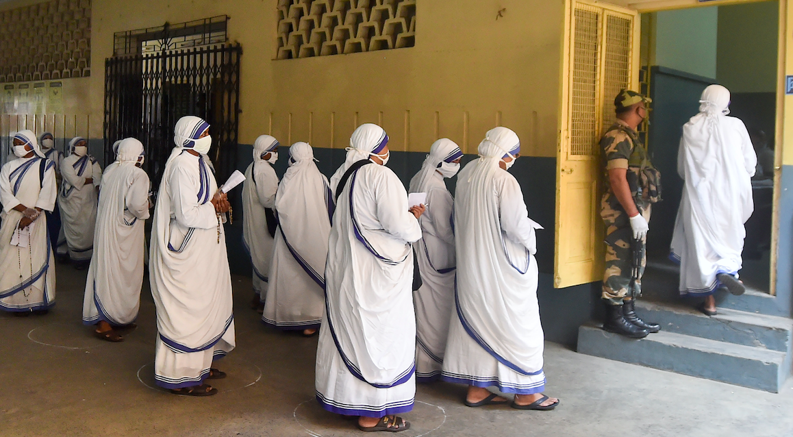 Nuns of Missionaries of Charity stand in a queue at a polling booth. Photo: PTI