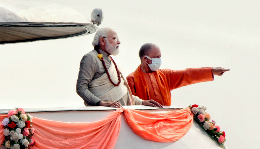 Prime Minister Narendra Modi with UP CM Yogi Adityanath on board a cruise ship during his visit to Varanasi, Monday, Dec. 13, 2021. Photo: PTI