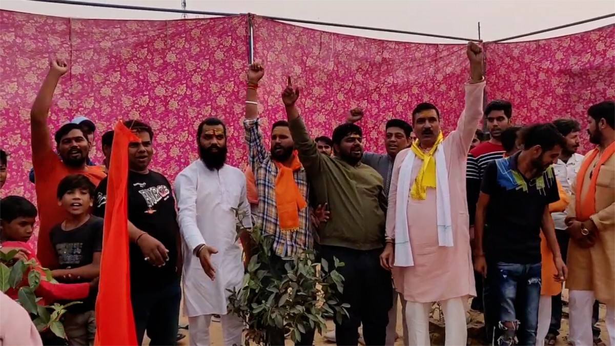 Amit Hindu (white kurta) and Monu Manesar (olive sweatshirt) using the 'Goli Maro' sloga. | Naomi Barton