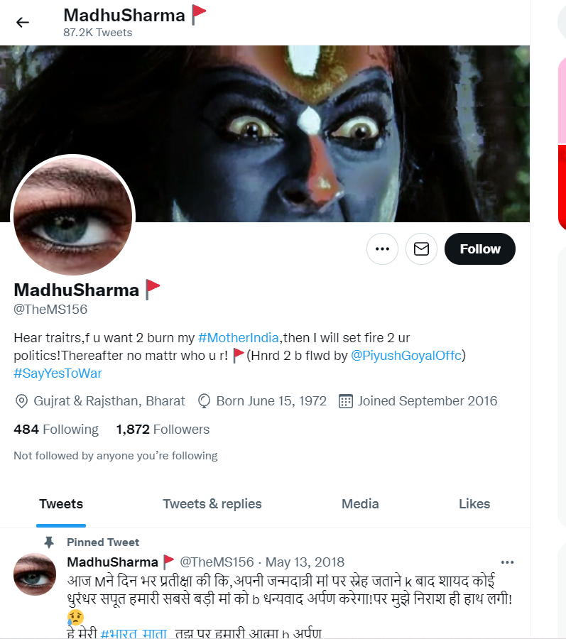 Her official Twitter account is followed by Union minister Piyush Goyal's office. Her Twitter bio has the hashtag '#SayYesToWar'.