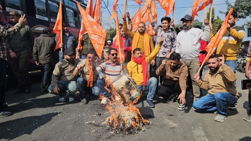 Dozens of rightwing activists carrying saffron flags burnt the effigy of J&K chief minister Omar Abdullah in Jammu while reiterating the demand of the BJP’s Bahu legislator Vikram Randhawa that the government should set up a task force to probe the land encroachment.